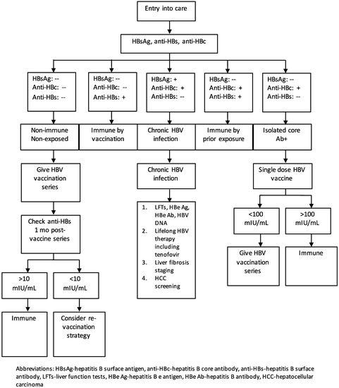 The initial evaluation for HBV exposure and infection is shown in Figure 1. All PLWH should be tested for immunity and exposure to HBV as outlined above. Non-immune, non-exposed persons (HBsAg negative, anti-HBc negative) should be vaccinated. Those who are anti-HBs positive and anti-HBc positive have resolved infection and do not need to be vaccinated. Those who are anti-HBs positive with a titer of at least 10 mIU/mL, following a complete vaccination series, are protected and do not require vaccination. Individuals with an isolated anti-HBc that is positive should be given a single dose of vaccine; if the anti-HBs titer is greater than 100 mIU/mL, one to two months later, the individual is immune and does not require further vaccination. If the titer is <100 mIU/mL, the individual should complete a standard vaccination series [24].