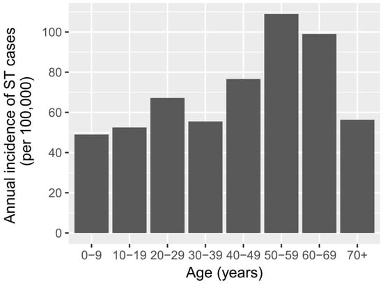 There was a similar proportion of females (51.3%) and males (48.7%) among the cases. The median age of ST patients was 30 years old, with the highest percentage of cases within the 20–40-year-old period (Figure 1). The age distribution of ST in males and females was very similar (Figure 1) and statistically not different (KS p-value = 0.65). While the highest number of ST cases occurred in the 20–40-year old age group, the age-specific incidence was highest in age groups between 40 and 70 years old (Figure 2).