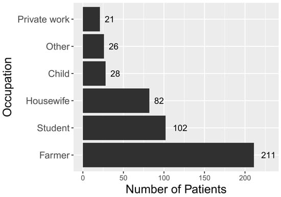 Farmers represented the main line of occupation among ST patients (45%), followed by students (22%) and housewives (17%) (Figure 3). The vast majority of patients were from rural areas (88%, n = 412) compared to 62% in the general population. Rural cases were overrepresented in the RDT-positive population, compared to the general population (p < 0.0001).
