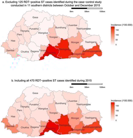 Spatial distribution of the incidences of clinically suspected scrub typhus cases that tested positive to the SD Bioline Tsutsugamushi test in Bhutan in 2015 ((a) excluding 125 RDT-positive ST cases that were identified during the case-control study conducted in 11 southern districts between October and December 2015, (b) including all 470 RDT-positive ST cases that were identified during 2015).