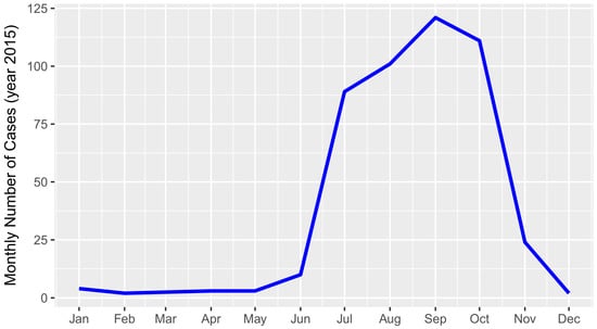 There was a very strong temporal pattern in the occurrence of RDT-positive clinical ST cases, with 97% of cases observed between June and November, peaking in September (Figure 5). A similar pattern was found in a study in West Bengal, India []. This time of the year coincides with the monsoon and the cropping season, which might favour both the density of the chiggers and people’s exposure to the vector through agricultural work.