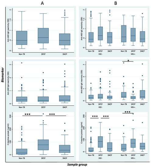 Antibodies against antigen 60 (A60) and levels of the acute-phase C-reactive protein are among biomarkers commonly evaluated for serological diagnosis of PTB. Anti-A60 antibodies initially showed good diagnostic potential, but subsequently demonstrated variable accuracy in areas with high PTB prevalence, and among HIV-positive patient subpopulations [,,]. C-reactive protein has shown promising results, particularly in HIV-positive individuals, but it is not PTB-specific and is elevated in several inflammatory conditions [,]. Furthermore, factors such as host immunogenetic background [], AFB burden and stage of disease [,] have been hypothesized to influence the heterogeneous pattern of immune response, including dominance of different immunoglobulin isotypes [,] typically observed in confirmed PTB and patients for whom TB was provisionally diagnosed but later ruled out [,]. The aim of this study was to evaluate distribution of C-reactive protein and anti-A60 immunoglobulin G (IgG) and immunoglobulin A (IgA) in different PTB diagnostic groups by HIV status, determine variation in diagnostic performance and identify the host and clinical characteristics that may influence the distribution of these biomarkers to inform PTB diagnostic biomarker research.
