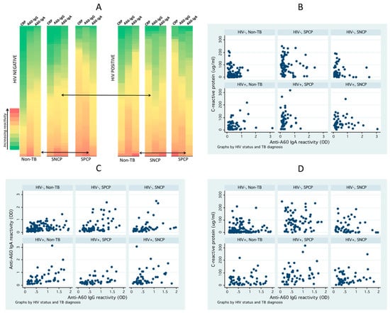 Biomarker reactivity and correlation by diagnostic group and HIV status. (A) Heat map of biomarker reactivity illustrates high degree of heterogeneity across patients and difference in reactivity between HIV−ve and HIV+ve patients. Individual patients are colored green to red according to increasing relative reactivity/concentration for biomarker (CRP, anti-A60 IgG, anti-A60 IgA). (B–D) Scatterplots of biomarkers shows slight but significant correlation of anti-A60 antibodies, and lack of correlation between anti-A60 antibodies and CRP.
