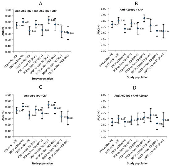 Estimated area under receiver operating characteristics (AUC) (with 95% CI) of four biomarker combinations; (A) anti-A60 IgG + anti-A60 IgA + CRP, (B) anti-A60 IgG + CRP (C) anti-A60 IgA + CRP, and (D) anti-A60 IgG + anti-A60 IgA for different study subpopulations.