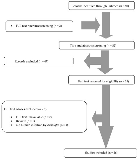A total of 80 articles from PubMed were screened. After reviewing the titles and abstracts, 33 articles were selected for full-text review. From them, nine were excluded: one was not an original paper (review), one did not involve infection in humans, and there were seven articles whose full text was unavailable. Two additional studies were found by hand-screening of the included articles’ references. Finally, 26 met the study criteria [3,4,8,9,10,11,12,13,14,15,16,17,18,19,20,21,22,23,24,25,26,27,28,29,30,31]. The review process is graphically presented in Figure 1.