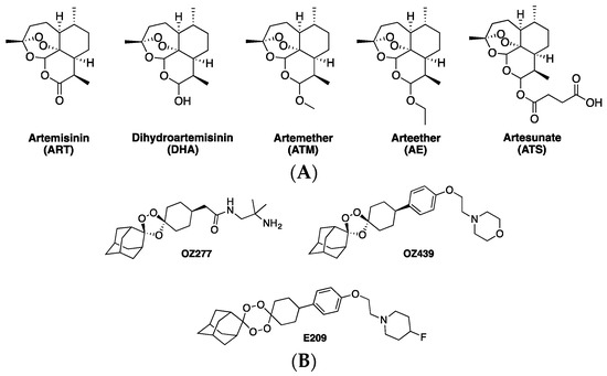 (A) Structures of artemisinin (ART) and other clinically viable derivatives. (B) Synthetic trioxane and tetraoxane ART analogs (see [2] for OZ277, OZ 439; [3] for E209).
