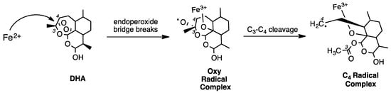 Bernard Meunier and colleagues [25] proposed an attractive, chemically logical scheme for radical formation by first studying adducts formed between ART and manganese(II) meso-tetraphenylporphyrin, which could be more easily demetallated and analyzed by NMR spectroscopy, relative to FPIX adduct. Porphyrin–ART adduct data suggested that an O-centered radical is first formed, which then rearranges to a C4 radical upon C3–C4 cleavage (Figure 4).