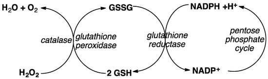Enzyme catalyzed reactions contributing to glutathione (GSH)/GSSG cycling in living cells.