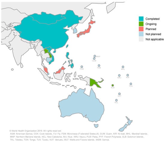Globally, by December 2018, 13 countries had completed a national TB patient cost survey using the methodological approach recommended by WHO, including five countries from the Western Pacific Region []. By April 2019, a total of eight countries in the Western Pacific Region had either completed a national TB patient cost survey or were in the process of implementing one. These countries are China, Fiji, Laos, Mongolia, Papua New Guinea, the Philippines, Solomon Islands, and Vietnam. Japan and Malaysia are currently planning a national TB patient cost survey. A summary of national TB patient cost surveys in the Western Pacific Region and their stages of progress is provided in Figure 1.