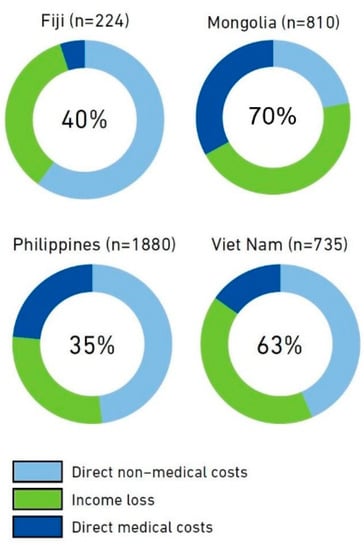 Four countries that have conducted a national TB patient cost survey in the Western Pacific Region were ready to report their results to WHO in 2018 as a part of routine annual reporting. WHO has been requesting that countries report this indicator as part of annual reporting (if data are available) since 2017 []. The four countries that were able to provide such data for the Global Tuberculosis Report 2018 were Fiji, Mongolia, the Philippines, and Vietnam. A summary of the results from these countries is provided in Figure 2 below; the proportion of TB patients and their households experiencing catastrophic costs ranged from 35% in the Philippines to 70% in Mongolia []. The main drivers of these costs vary by country (and even within countries, according to the region or sub-group) []. In the Philippines and Vietnam for example, the main drivers of costs were direct non-medical costs and indirect costs, while in Mongolia, direct medical costs and direct non-medical costs were the main drivers of cost for drug-susceptible and drug-resistant TB patients, respectively [].