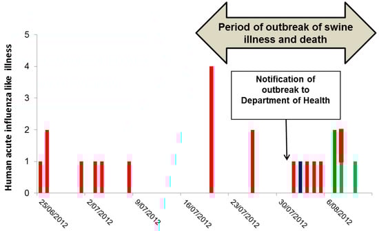 Date of onset of influenza-like illness and respiratory virus detections in 23 workers at a piggery in WA preceding and during an outbreak of respiratory tract illness and deaths in swine. The red columns are those with respiratory illness without laboratory confirmation either because they were not tested (17 workers) or because the results were negative or inconclusive. The blue column is confirmed seasonal A(H3N2) and the green are confirmed RV infections. Initial serologic testing at the DAFWA had suggested influenza infection and on 4 August 2012, a site visit was made by officers from the CDCD and the DAFWA.
