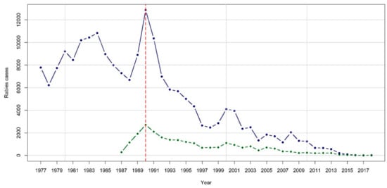 Evolution of fox cases in the 28 EU countries (data source: Rabies Bulletin Europe, Rabies Information System of the WHO Collaboration Centre for Rabies Surveillance and Research; http://www.who-rabies-bulletin.org/Queries/Default.Aspx). Red dashed line: 1989, start of European Commission co-funding and large scale ORV programs; Blue line: fox cases; Green line: domestic cases.