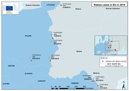 - European Commission. Overview Report—Rabies Eradication in the EU; European Commission: Luxembourg, 2017; p. 26. [Google Scholar]