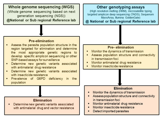 Unprecedented efforts in malaria control over the last 15 years have led to a substantial decrease in both morbidity and mortality in most endemic settings. However, these progresses have stalled over recent years, and resurgence may cause dramatic impact on both morbidity and mortality. Nevertheless, elimination efforts are currently going on with the objective of reducing malaria morbidity and mortality by 90% and malaria elimination in at least 35 countries by 2030. Strengthening surveillance systems is of paramount importance to reach those targets, and the integration of molecular and genomic techniques into routine surveillance could substantially improve the quality and robustness of data. Techniques such as polymerase chain reaction (PCR) and quantitative PCR (qPCR) are increasingly available in malaria endemic countries, whereas others such as sequencing are already available in a few laboratories. However, sequencing, especially next-generation sequencing (NGS), requires sophisticated infrastructure with adequate computing power and highly trained personnel for data analysis that require substantial investment. Different techniques will be required for different applications, and cost-effective planning must ensure the appropriate use of available resources. The development of national and sub-regional reference laboratories could help in minimizing the resources required in terms of equipment and trained staff. Concerted efforts from different stakeholders at national, sub-regional, and global level are needed to develop the required framework to establish and maintain these reference laboratories.