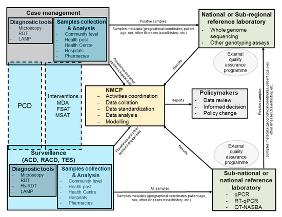 Globally, a consensus has been established that good quality data are required to improve disease surveillance, especially in low- and middle-income countries (LMICs) [80]. The establishment of well-equipped reference laboratories with well-trained staff in most malaria endemic settings will require concerted efforts from different stakeholders, and several challenges ranging from funding to staff retention and procurement of required reagents are only a part of them [67,81,82]. However, the use of NGS could be centralized to very few sub-regional reference laboratories located in malaria endemic countries [36,83,84]. This requires a lot of effort to develop the capacity not only for sequencing but more importantly for data analysis, a critical part in the path for developing countries to get access to these techniques [85,86,87]. This should be a concerted effort not only from the malaria community but from the global health community, as other diseases such as tuberculosis (TB), human immunodeficiency virus (HIV), and other bacterial and viral infections may benefit as well from these centers of excellence [88]. The private sector should be involved to support the development of data sharing and storage platforms, and that will require clear regulations to be set up by local authorities on data privacy and ownership [89,90]. Support from well-established and expert laboratories in developed countries would be required, and establishment of sustainable external quality assurance (EQA) programs will be of paramount importance [91]. The development of sub-regional center of excellence will also require the establishment of samples and data sharing policies between different countries, and initiatives such as the Malaria Genomic Epidemiology Network (MalariaGEN) and Plasmodium Diversity Network Africa (PDNA) are providing examples of successful platforms for collaboration and data sharing [92,93]. It is also crucial that national malaria control programs (NMCPs) are playing a central role in these changes (Figure 2), and they must develop clear policies based on their needs and resources, provide clear guidance to the collaborating laboratories and the different key stakeholders at each level of the health system, and coordinate the different activities. With decreasing transmission in some settings and not neighboring regions, imported malaria cases will become an increasing threat to elimination, forcing different countries to cooperate. In China for example, almost all malaria cases are now imported, not only from neighboring countries, but also from Africa [94]. Therefore, it should be easier to convince the malaria stakeholders that approaches at the different levels are required, and sub-regional centers of excellence for genomics analyses could be a cost-effective way of improving collaborations between countries for the same goal of malaria elimination and eradication.