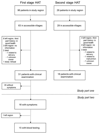 In a clinical study carried out in 2004 on endocrinological changes and the involvement of the heart in second stage HAT (detection of parasite, pathological cerebrospinal fluid), clinical parameters from 29 patients were assessed before treatment, at the end of treatment, and after a follow-up of three months [12,13,14]. Additionally, in the framework of clinical trials carried out between 2004 and 2005, clinical parameters were documented before and after treatment (but without a follow-up of three months) in 96 first stage HAT patients (parasitology confirmed) in Vanga. In these trials, the safety and efficacy of the newly developed drug pafuramidine was compared to the standard treatment with pentamidine for first stage HAT [15,16].