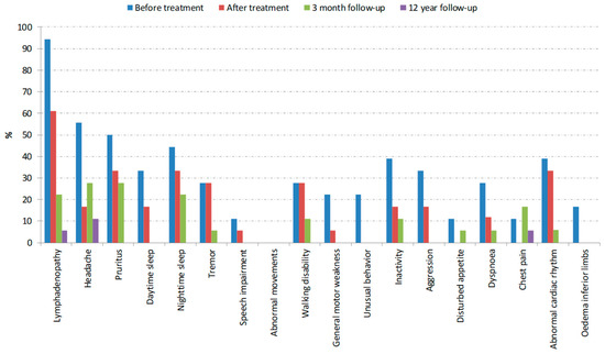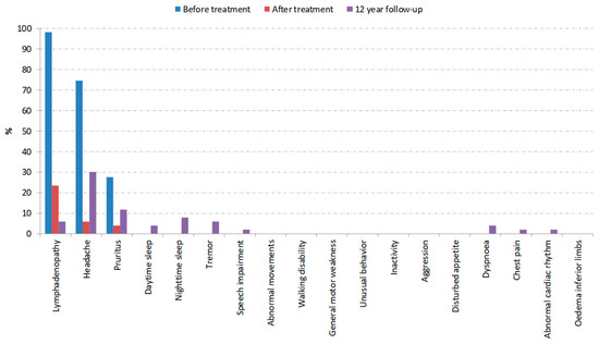 First, the patients improved after the treatment and subjectively did not notice remaining minor symptoms at the end of treatment. All these symptoms were generally mild, and the patients did not seek medical help. It could be possible that the symptoms did not really disappear but persisted at a level below immediate perception. This would mean that sequelae persist even more than a decade after treatment and include headaches, pruritus, sleeping disorders, and rare neurological deficits in the absence of persisting parasites. The description of the signs and symptoms described in children [22,23] and case series of adults [10] strengthens the hypothesis of persistence of sequelae.