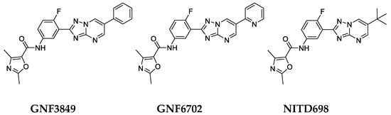 Several research groups have been working on the development of anti-trypanosomal compounds with a potential to treat HAT. The most significant challenge has been achieving brain penetration for chemical molecules, which is critical for killing brain stage parasites to achieve complete cure in stage 2 infection. For example, N-myristoyltransferase inhibitors have been shown to be potent trypanocides and curative of stage 1 models of the disease, but failed to achieve reasonable brain concentrations, thereby leading to failure to cure stage 2 models of HAT [18]. Attempts to screen compound libraries specifically inhibiting kinases [19] and proteases [20] also identified potent trypanocides which failed to achieve complete cure in mouse models, due to lack of adequate brain penetration. Our attempts to find novel trypanocides led to the identification of potent growth inhibitors. Further medicinal chemistry optimization of compounds led to brain-penetrant derivatives belonging to TP class (GNF6702 and NITD689) which completely cured both stages of infection.