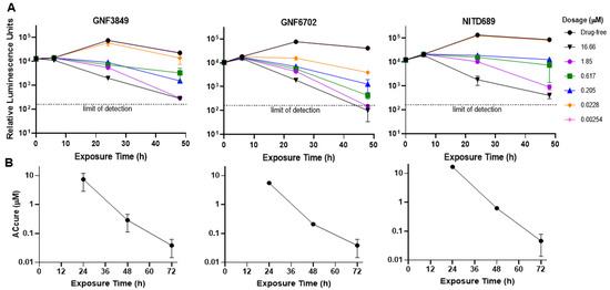 Triazolopyrimidines were evaluated for their potential to kill parasites under in vitro conditions. Time-to-kill assessment showed that all the three compounds were trypanocidal. At an early time point (6 h post exposure), no significant cidality was seen compared to the untreated control, even at the highest concentration tested (16.7 µM). However, at 24 and 48 h post-incubation, with compounds, significant kill was evident, suggesting this class of inhibitors requires 24 h in order to show cidality. All three compounds showed concentration and time-dependent lethality (Figure 2A).