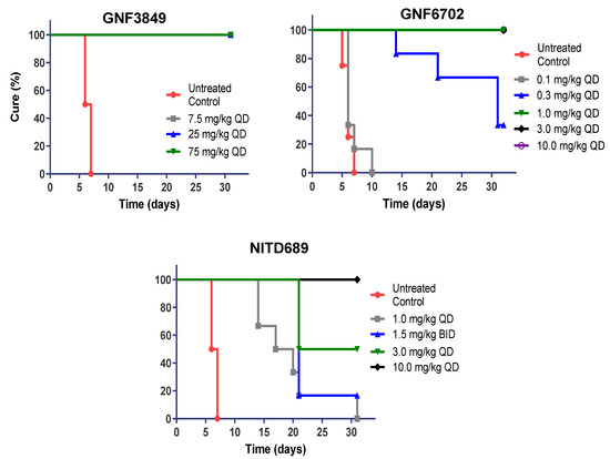 In vivo efficacy of GNF3849, GNF6702 and NITD689 in a HAT hemolymphatic mouse model. Six mice each were orally treated for four days, with varying doses of compounds, three days post-infection. Mice were monitored for 30 days post-infection, and cure plot (Kaplan–Meier plot) showing percentage of animals cured over time are shown.
