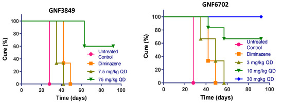 In vivo efficacy of GNF3849, GNF6702 and NITD689 in HAT meningoencephalic mouse model. Six mice each were orally treated for seven days, with varying doses compounds, 21or 22 days post-infection. Mice were monitored for 92–94 days post-infection, and cure plots (Kaplan–Meier plots) showing percentage of animals cured over time are shown. Three mice each were dosed with vehicle control and diminazene aceturate. Note the early parasite recrudescence in mice treated with diminazene aceturate.