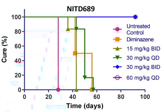 NITD689 had promising physicochemical properties, better permeability and the lowest efflux ratio, although the exposure was lower than GNF6702 (Table 2, Table 4 and Table 6). NITD689 also had a moderate half-life of 1.6 h; hence, we adopted both a once-daily and twice-daily dosing schedule. Both doses of 15 mg/kg twice daily and 30 mg/kg once daily failed to cure, suggesting that the time and concentrations reached were not sufficient to kill all parasites in the brain. However, 30 mg/kg twice daily and 60 mg/kg once daily of NITD689 achieved complete cure, without relapse.