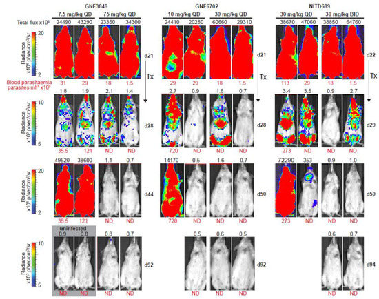 Bioluminescence imaging of mice infected with T. b. brucei. Dose-dependent clearance of parasites from triazolopyrimidine class of inhibitors. In vivo quantification of bioluminescent T. b. brucei (GVR35–VSL2) in infected mice before and after treatment; day 21/22, start of treatment; day 28/29, 24 h after last dose; day 44/50 and day 92/94, parasite recrudescence or cure in mice treated with GNF3849, GNF6702 and NITD689 (images of two representative mice from a total of six mice are shown). Blood parasitemia (in parasites/mL, red font below image) and whole mouse total flux (in photons per second, black font above image) values of each animal are shown; QD, once daily; BID, twice daily; N.D., not detectable; Tx, treatment. The same two representative mice are shown for all time points. Mice with detectable parasites were euthanized and are therefore not shown at day 92/94. Images from uninfected mice, aged-matched for day 21, that were collected independently, using the same acquisition settings, are shown in the gray box (two of three mice are shown).