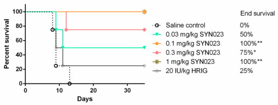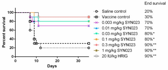 In vivo efficacy of SYN023 in a Syrian hamster post-exposure prophylaxis (PEP) model. Human rabies immune globulin (HRIG) at 20 IU/kg or SYN023 at 0.003, 0.01, 0.03, 0.1, 0.3, and 1 mg/kg were administered in conjunction with rabies vaccine to rabies virus (RABV) (BD06)-infected Syrian hamsters at 24 h post infection. Vaccine was administered on Days 0, 3, 7, 14, and 28. Hamster mortality and morbidity were monitored daily. Vaccine only and untreated groups were included as negative controls. * indicates p < 0.05.