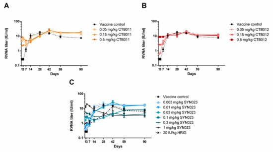 Changes of serum anti-rabies antibody titers in non-challenged Syrian hamsters. (A) CTB011 (0.05, 0.15, 0.5 mg/kg), (B) CTB012 (0.05, 0.15, 0.5 mg/kg), (C) SYN023 (0.003, 0.01, 0.03, 0.1, 0.33, 1 mg/kg), or HRIG (20 IU/kg) were administered to the opposite site of vaccination on Day 0. Serum RVNA levels were monitored by performing a rapid fluorescence focus inhibition test (RFFIT) on blood samples.