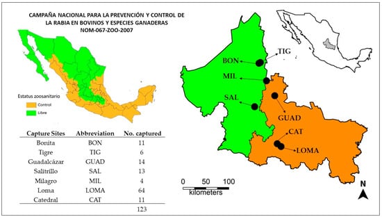 A total of 123 common vampire bats were captured from seven sites throughout San Luis Potosí (Figure 1) during a 6-week period in the summer of 2018 (Jul–Aug). The majority of the bats (n = 75) were captured in the two southern capture locations (Loma and Catedral), where rabies had been reported during activities conducted by the Mexican national campaign for prevention and control of rabies in livestock [7,12]. The remaining bats came from the other 5 locations throughout the state.