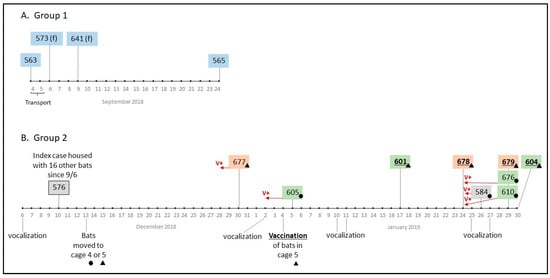 Timeline of vampire bat observations and mortalities recorded in Madison, Wisconsin, from September 2018 to January 2019. All bats were captured in México in August and transported to Madison on September 4–6. Bats from Groups 1 (A) and 2 (B) were never in contact since capture and presented two distinct RABV lineages based on phylogenetic analysis of N and G gene sequences. Bats in Group 1 with “(f)” are females and were never in contact with males from the same site. Sites of capture are color coded: Loma (blue), Catedral (gray), Guadalcázar (green), and Milagro (orange). Group 2 bats moved to Cage 4 after the first rabies mortality in that group (#576) are indicated with a circle and those moved to Cage 5 with a triangle. Bold/underline lettering indicates bats that were vaccinated. “V+” indicates RABV shedding detected in oral swabs prior to mortality.