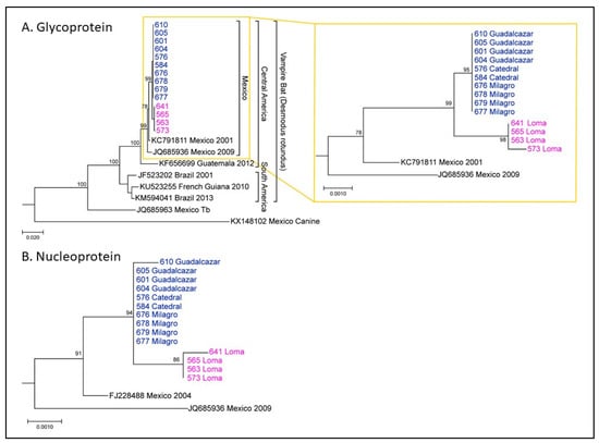 Phylogenetic analysis of glycoprotein (A) and nucleoprotein (B) nucleotide sequences. Phylogenetic trees were estimated by Maximum Likelihood in Mega7. Newly generated sequences from Mexican Desmodus rotundus (magenta, Group 1 and blue, Group 2) clustered with isolates of RABV circulating in Desmodus rotundus in Mexico (A, left). The yellow box highlighted on the glycoprotein gene tree is enlarged on the right to show more detail. Numbers at branch points indicate bootstrap value (out of 1000 replicates). Scale bars indicate number of changes per site. Reference sequences from RABV strains circulating in vampire bats in México, Guatemala, Brazil, and French Guiana were included; references from RABV isolated from a Mexican free-tailed bat (Tadarida brasiliensis) and a dog (historical) were included as outgroups. Reference sequences are labeled with accession number, country, and year of isolation.