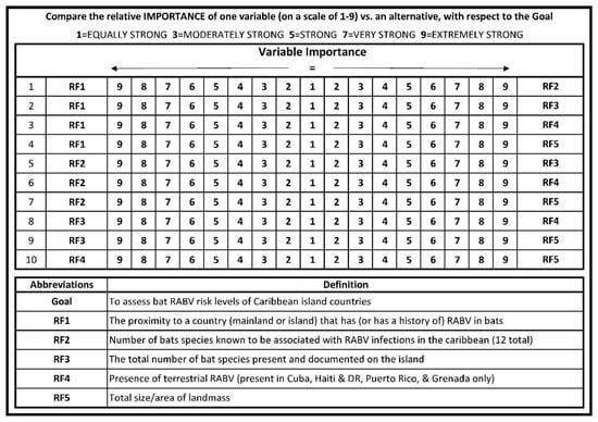 A questionnaire consisting of pairwise comparison among the five risk factors was developed, based on the sample questionnaire proposed by Siddayao et al. 2014 []. The questionnaire (Figure 1) was then distributed to pre-selected subject matter experts (SMEs) via email. Inclusion criteria for SMEs included participants of a regional rabies working group, and or rabies public health expertise with research experience in bat-specific rabies ecology or epidemiology in the region. Credentials among the 8 solicited SMEs were as follows: 5 held doctor of veterinary medicine (DVM) degrees, 4 held doctor of philosophy (PhD) degrees with area of study ranging from biogeography to molecular genetics, 3 held master of public health (MPH) degrees (or equivalent), 4 were experts in North and or South American bat ecology and biology, 4 were experts in bat rabies epidemiology, 5 have served as rabies public health advisors, and 2 have served as heads of a World Organisation for Animal Health (OIE) reference laboratory. This questionnaire allowed SMEs to assign a number between 1 and 9 representing the relative importance of one risk factor relative to an alternative risk factor. This comparison was conducted for all possible pairs of risk factors. We then used the AHP to assemble matrices from each of the SMEs questionnaires. An aggregate matrix was assembled by averaging the value of each SME pairwise comparison to the nearest whole number, 1–9. We then calculated the sum of each matrix column within the aggregate matrix and normalized the matrix by dividing each cell value by the sum of that column. Finally, criteria weights for each risk factor were calculated by averaging the rows of the normalized matrix. The criteria weights of each risk factor calculated from the aggregate matrix were used in conjunction with the AHP plug-in tool [] for ArcGIS software version 10.5 (ESRI, Redlands, California) to perform the geospatial analysis. To test for consistency between SME pairwise comparisons, the AHP plug-in tool also calculated a consistency ratio (CR).