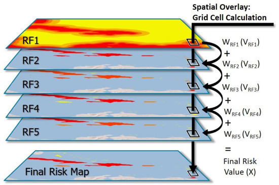 Following the risk categorization within all of the five RFs, we used ArcGIS to spatially overlay (Figure 2) each of the RF layers. This was accomplished using the raster calculator tool to calculate the sums of the value of each individual RF and spatially correlating grid cell (V), multiplied by the weight of each corresponding layer (W), to get a final value (X):