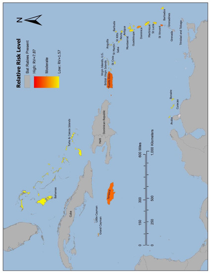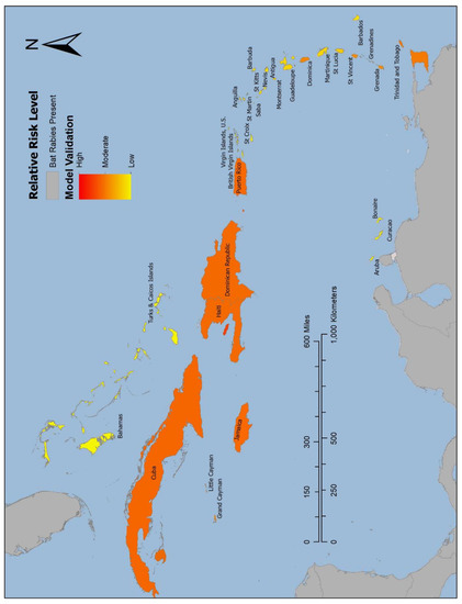 The validation model (Figure 3) determined Cuba (6.17) and the island shared by the Dominican Republic and Haiti (6.08) as the highest risk, followed by Trinidad and Tobago (5.24), and Grenada (5.31). All these islands have documented occurrences of laboratory confirmed rabid bats [,,,,]. Risk values attained from the validation model for each of the Caribbean countries where bat rabies has been detected are displayed in Table 3, along with the values from the risk model. The colorimetric scales in Figure 3 and Figure 4 are scaled to these values, reflective of the relative risk level.