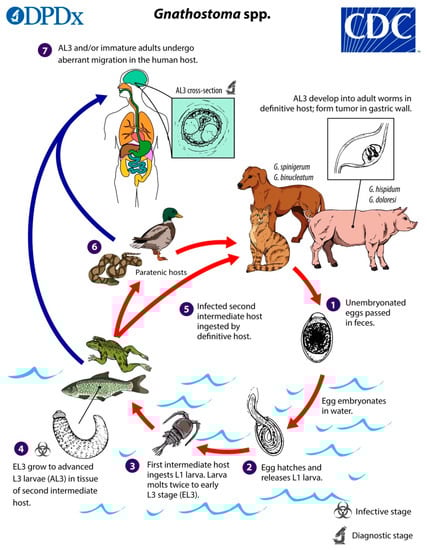 - Moore, D.A.; McCroddan, J.; Dekumyoy, P.; Chiodini, P.L. Gnathostomiasis: An emerging imported disease. Emerg. Infect. Dis. 2003, 9, 647–650. [Google Scholar] [CrossRef] [PubMed]