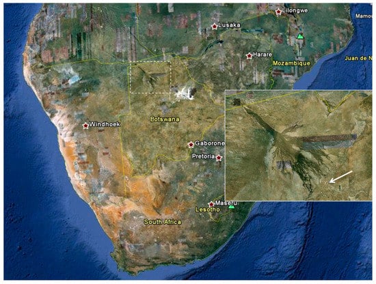 Satellite image of southern Africa. Dashed outline: Okavango delta region in northeast Botswana. Inset: Enlarged view of Okavango delta region showing location of Maun (arrow). (Source: Google Maps, www.google.com/maps/).