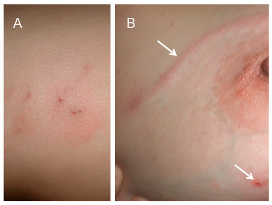 (A) Skin nodules caused by localised Gnathostoma sp. L3 larvae. (B) Linear larva migrans lesion on skin of breast (upper arrow) and skin nodule (lower arrow).