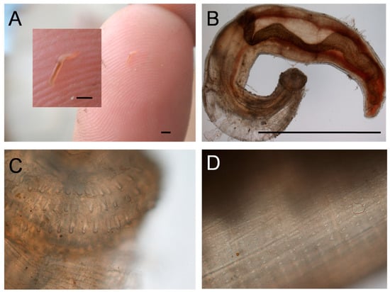 Gnathostoma sp. L3 larva. (A) As extracted from skin lesion. (B) View under ×4 objective. (C) Head showing four rows of hooks, ×10 objective. (D) Body showing rows of spines, ×10 objective. Bars are approx. 2 mm.