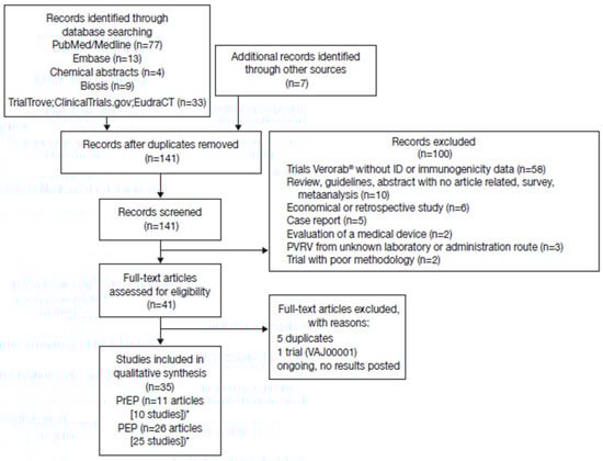 A total of 144 potentially relevant citations were identified from the databases searched and other sources, of which 35 met the inclusion criteria (Figure 1). There was considerable heterogeneity across studies in terms of study designs, regimens, number of vaccination sites, vaccine potency, population assessed, and time series reported, precluding a meaningful pooled/meta-analysis of the RVNA titers. The intention here is to display the available data to allow the reader to assess general trends within selected groupings. Seroconversion was defined as a titer ≥ 0.5 IU/mL in all studies.