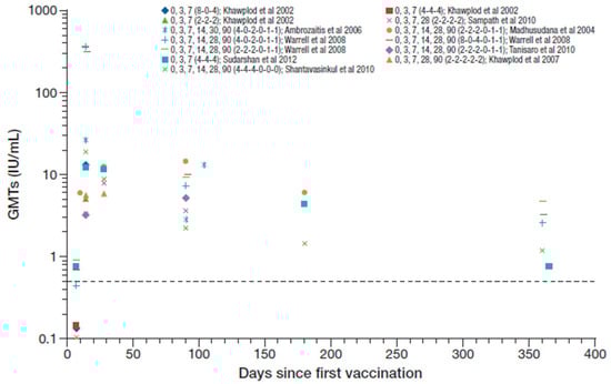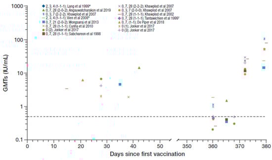 GMTs achieved were 4.51 IU/mL at day 35 decreasing to 0.35 IU/mL at 1 year. The 1-site 1-week (0,7 [1-1]) regimen achieved a 99% seroconversion rate after day 21, and a GMT of 7.59 IU/mL []. The 1-, 2-, or 3-site single-visit regimens achieved seroconversion rates of 90%, 100%, and 100% at day 28, respectively, with reported GMTs of 2.0, 6.7, and 4.2 IU/mL. After one year, only 20%, 20%, and 40% remained seroconverted, respectively, and the GMTs in the groups decreased to below LLOQ, 0.2 and 0.5 IU/mL []. In another study, which included a 2-site single visit regimen, the seroconversion rate was 38.5% at 1 year with a corresponding GMT of 0.41 IU/mL [].