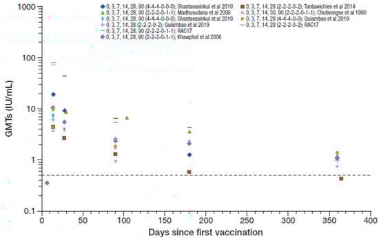 Seroconversion rates from day 14 to 56 after the first vaccination and at 1 year across the studies identified were 90–100% and 20–96%, respectively [,,,,,,,]. The RVNA GMTs reported across the studies irrespective of PrEP regimen (n = 926), including following booster vaccination after one year, are summarized in Figure 2 [,,,,,,,,,,]. The GMT range across studies from day 14 to 56 after the first vaccination was 1.90–14.35 IU/mL decreasing to ≤1.9 IU/mL at 1 year [,,,,,,].