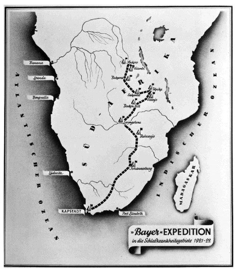 (Bayer Archive. 1921. (Picture 0-19682)) Route of the Bayer expedition starting on 2 November 1921 in Cape Town, travelling to the areas most affected by African sleeping sickness in what is today Tanzania, Burundi, Ruanda, DR Congo as well as a small part of Mozambique, Zimbabwe and Zambia, where the expedition ended in Kiambi in late 1922.