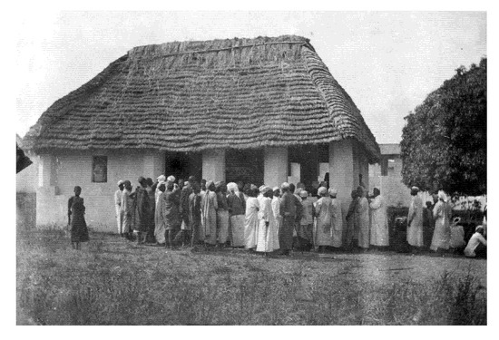 (Bayer Archive. 1921. (Picture 0-34295)) Screening of local population for symptoms of African sleeping sickness in the Urambi camp at Lake Tanganyika in 1921.