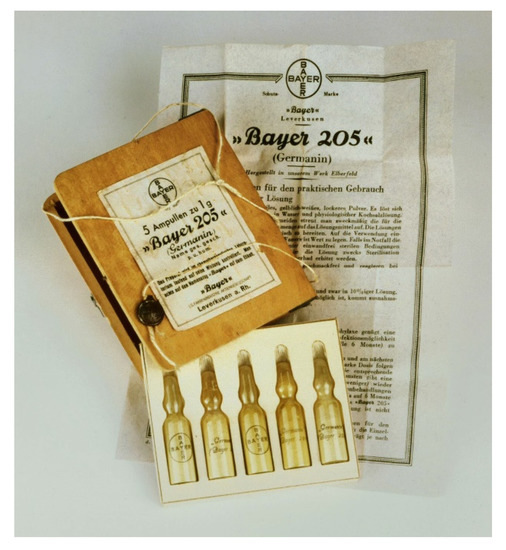 The scientific experiments began in January 1922 and showed that oral applications only had a temporary effect and that injections were much more effective. The results were so convincing that the Governor General of Belgian Congo even invited the expedition to continue its work in the southern Congo region. In 1923, the “remedy for tropical diseases”—Suramin—came onto the market under the patriotic name “Germanin” (Figure 4).