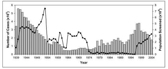 Since the mid-1970s, decreasing vector control and disease prevention as well as screening and treatment of populations at risk resulted in a steady increase in the number of reported cases of African sleeping sickness. This most recent epidemic lasted until the late 1990s. Around the year 2000, the scale of African sleeping sickness had once again almost reached the levels of the epidemics seen at the beginning of the 20th century (Figure 5) [11,13].