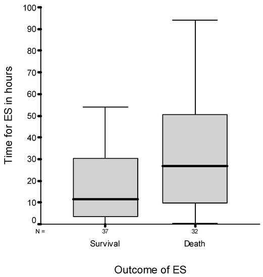 The mean time interval between the last application of melarsoprol and start of ES was 35.4 h. This interval is the time between melarsoprol administration and the development of symptoms and signs of an impending encephalopathy, during which subsequent doses of the drug are withheld. Half of the patients developed ES within 23.5 h after the last application, and 75% did so 47.7 h within the last drug application. Figure 1 shows the median time interval distribution for the development of ES after the last melarsoprol application, discriminated according to the outcome of ES. The interval for the occurrence of ES after the last dose of melarsoprol before ES was not significantly different between survivors and fatalities (Mann–Whitney test, p value: 0.08).