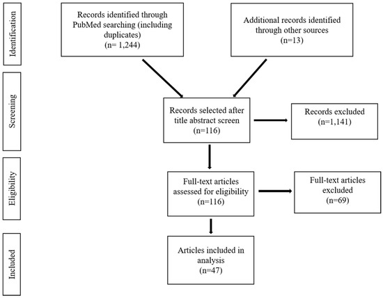 A systematic literature review was conducted using the PubMed online database. Review and non-review articles were identified using the following search terms, “malaria diagnosis”, “malaria control and elimination diagnostics”, “malaria diagnosis challenges”, “saliva malaria diagnostic”, “Innovative malaria tools” and “Asymptomatic malaria”. The literature search was conducted in September–October of 2019 and January 2020. It included majority review and a few non-review articles, published between 2009 and 2020, written in the English language, involved research about humans only and explained in great detail about malaria diagnostic methods or the challenges related to malaria diagnosis. The total number of articles found in the database was 1244. Thirteen additional articles were identified using Google Scholar and the WHO website. Through the careful reading of article titles and abstracts, elimination of duplicates, 47 articles were selected for full-text review (Figure 1). We provide a brief review of current and under development malaria diagnostic options and diagnostic challenges.
