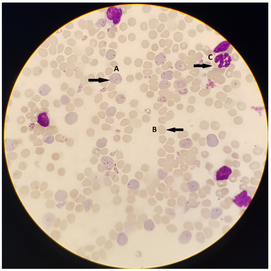 Microscopy of a thin smear P. falciparum infected erythrocytes stained with Giemsa. (A) A red blood cell infected with two malaria parasites in the “ring” stage as seen under a microscope at 100× oil immersion. (B) A normal uninfected red blood cell. (C) A normal leukocyte.