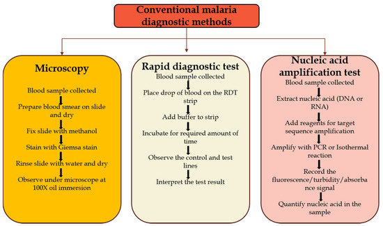 Flowchart of the currently used malaria diagnostic methods. Adapted from Ragavan, K.V. et al. [24].